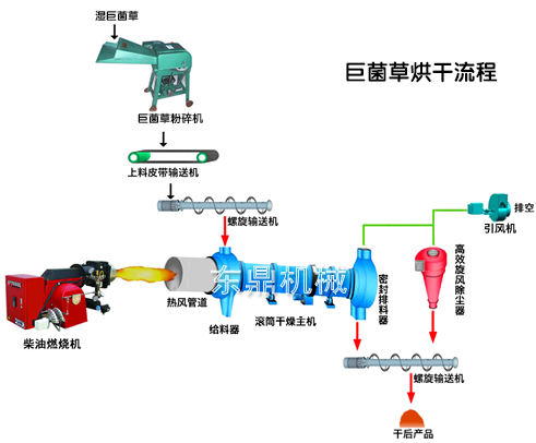 巨菌草烘干機,主要由巨菌草破碎設備,巨菌草粉碎機,上料皮帶運輸機,螺旋輸送機,柴油燃料機,熱風管道,給料器,滾筒主干燥機,密封拌料機,螺旋輸送機,旋風除塵器,引風機等組成,根據物料狀態及用途用戶可以適當選配擠壓脫水設備和環保除塵設備。在機器工作時,濕物料先經過巨菌草粉碎機,在此過程中完整的巨菌草植株被迅速破碎,成為大小均勻的草料,然后隨著上料設備和螺旋輸送設備進入滾筒內部,至此,巨菌草烘干的前期準備工作正式完成。在滾筒內壁設置有鏟板,在滾筒內部的巨菌草碎料被抄板不斷抄起,這是為了讓巨菌草可以充分和滾筒內部的熱風接觸,提升設備的烘干效果,達到事半功倍的作用。由于滾筒設置有傾角,因此物料會隨著滾筒轉動由一端滑向另一端,直到出料口完成物料的烘干階段,烘干好的物料會隨著出料口的螺旋輸送機被運至包裝打包的階段,滾筒中的廢氣會進入除塵設備,保證氣體不會污染大氣,經過除塵脫硫之后,最終排入空氣中。